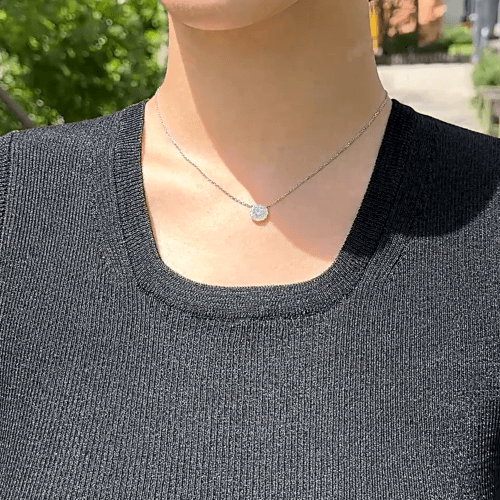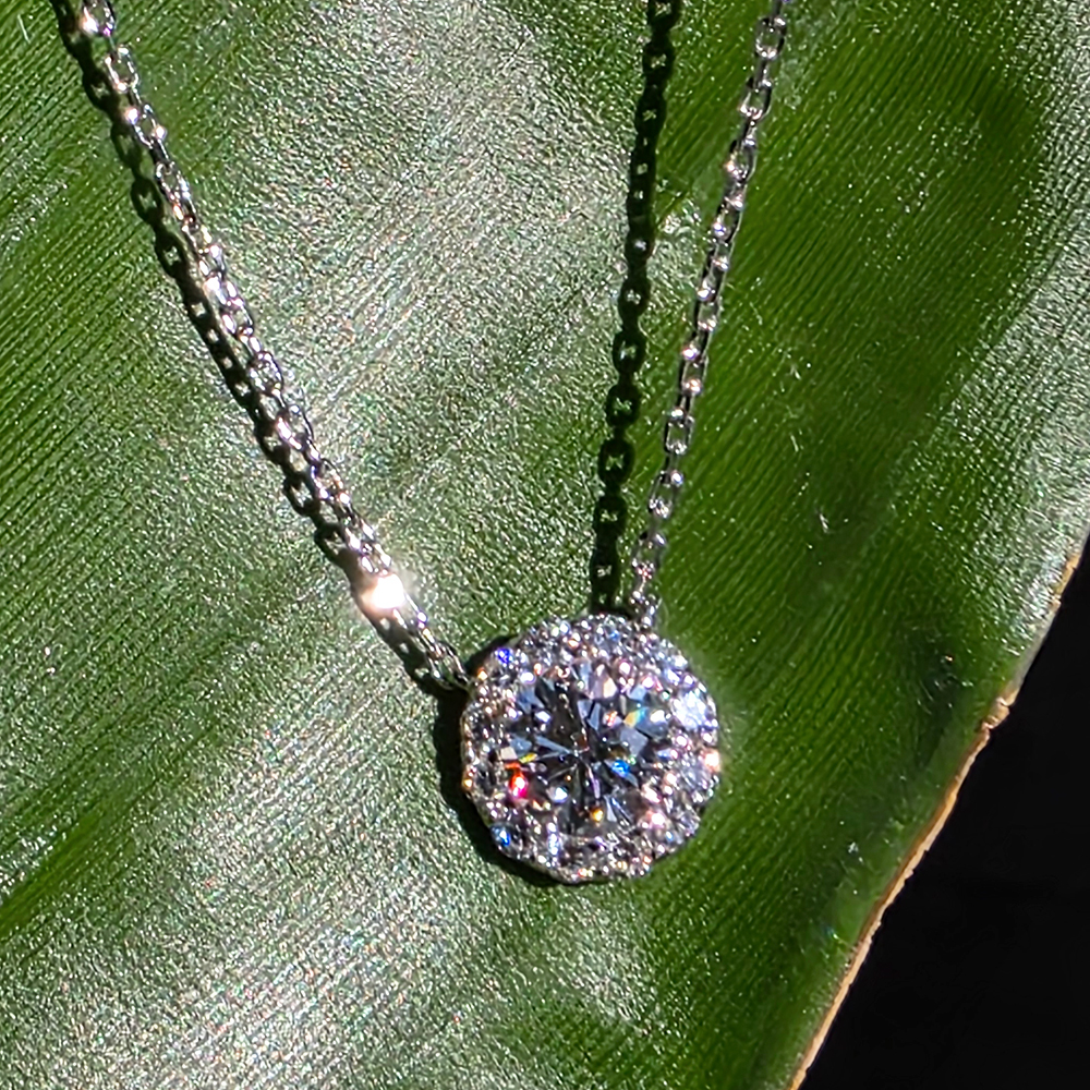 인게이지먼트 네크리스, 화이트골드, 라운드 다이아몬드, D및 VVS 등급의 1캐럿 랩다이아몬드. D 및 3EX 등급의 랩 멜리다이아몬드.