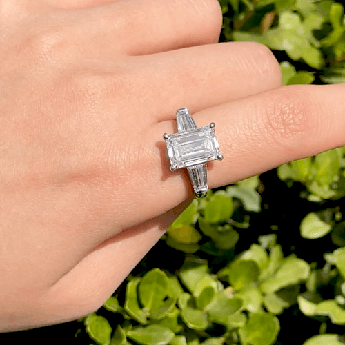 쓰리스톤 링, 화이트골드, 에메랄드컷 & 테파 랩다이아몬드, D 및 VVS 등급의 1 - 5ct 랩다이아몬드.