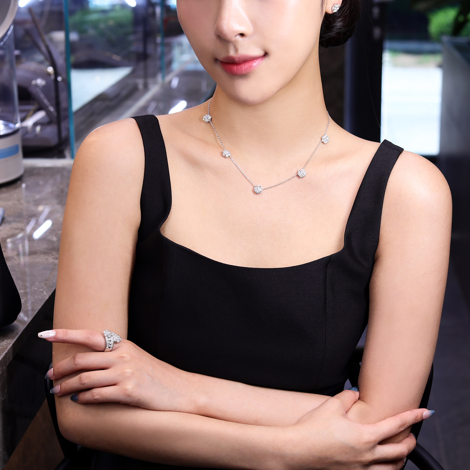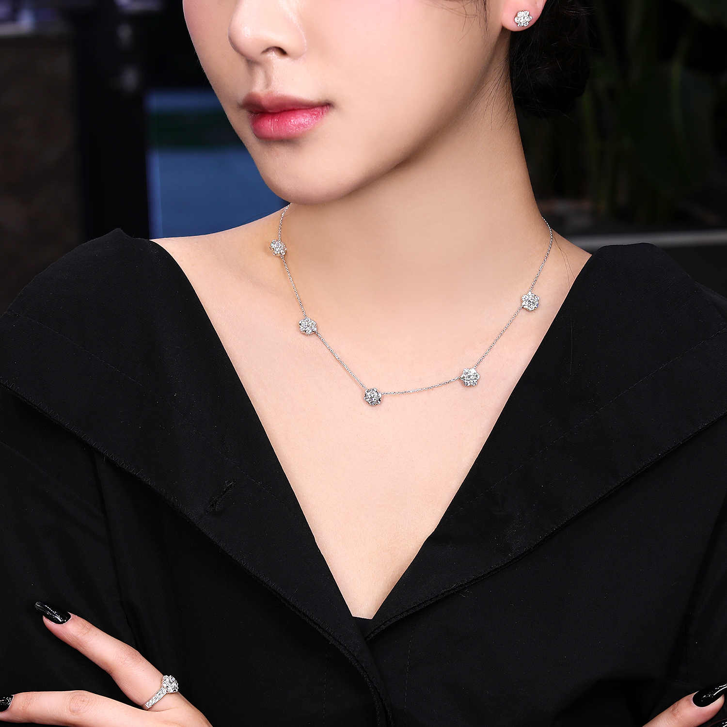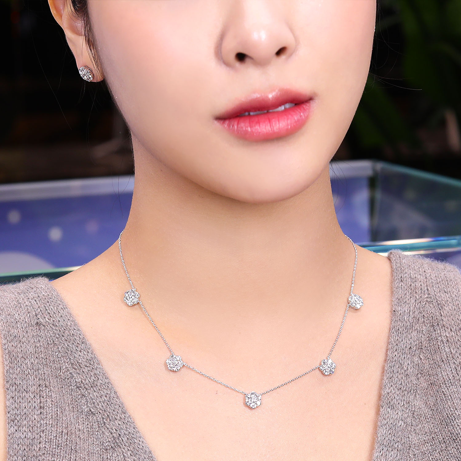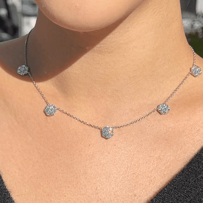 플로레뜨 5모티브 네크리스, 화이트골드, 라운드 다이아몬드, D 및 VVS 등급의 랩다이아몬드.