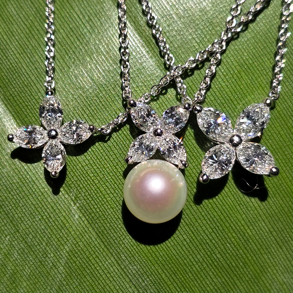 빅토리아 네크리스 미디움, 화이트골드, 마퀴즈 다이아몬드, 남양진주 D 및 VVS1 등급의 랩 다이아몬드.