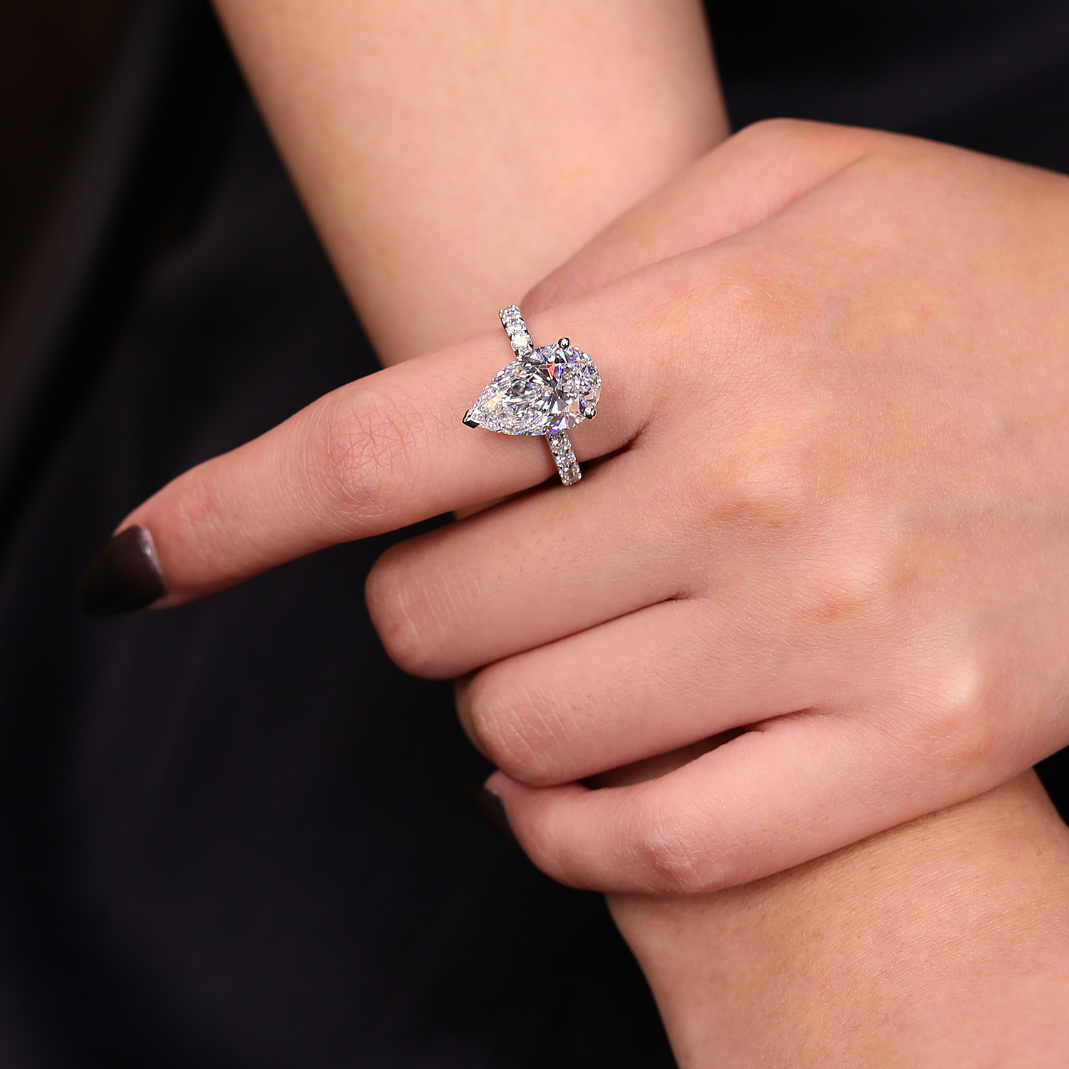 인게이지먼트 링, 화이트골드, 페어 다이아몬드, D 및 VVS 등급의 1 - 5캐럿 랩다이아몬드. D및 3EX 등급의 멜리다이아몬드.