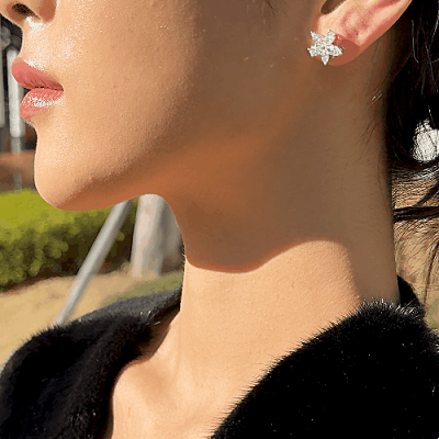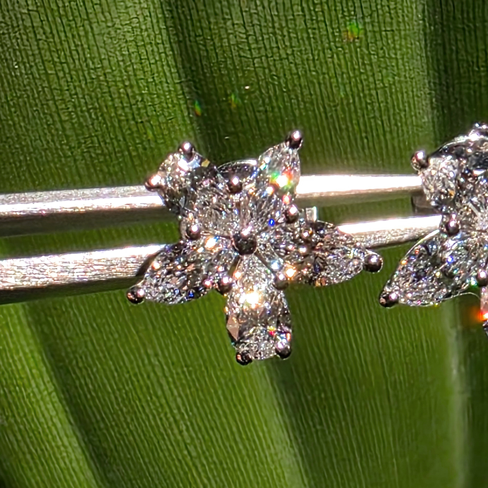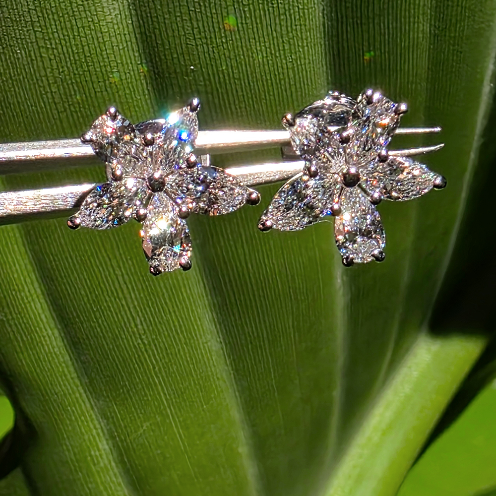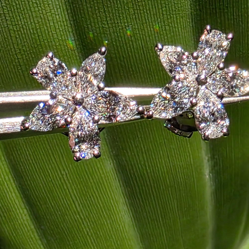 빅토리아 클러스터 이어링, 화이트골드, 페어, 마퀴즈 쉐입 다이아몬드, D및 VVS IDEAL 등급의 랩다이아몬드.