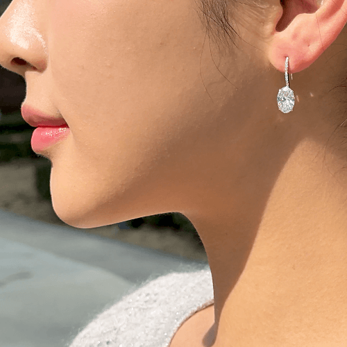 오벌 드롭 이어링, 화이트골드, 오벌 다이아몬드, D 및 VVS IDEAL 등급의 랩다이아몬드.