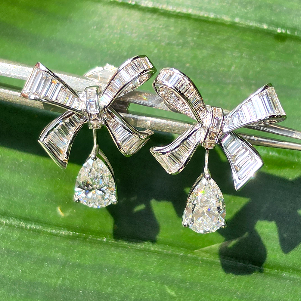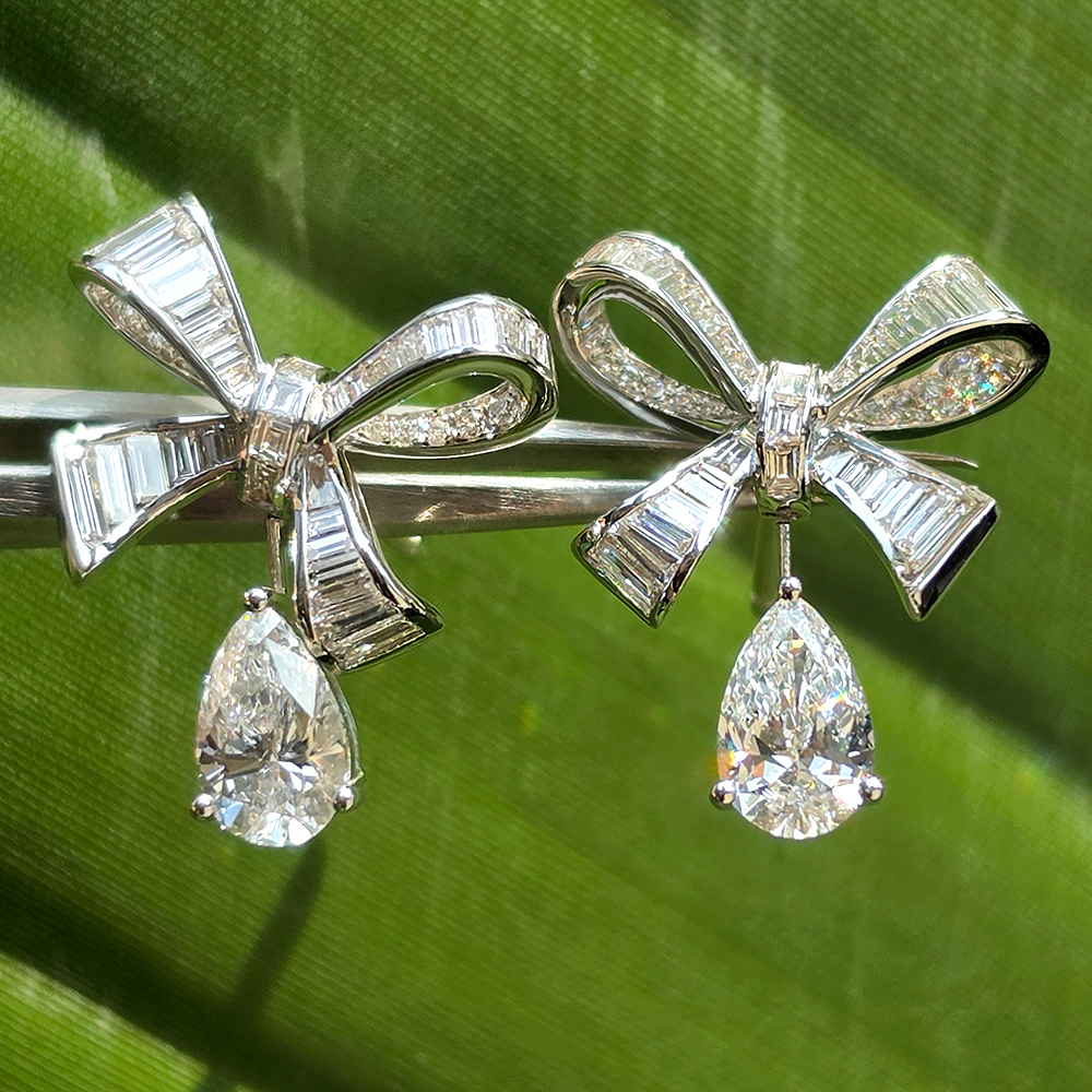 에메랄드 & 페어컷 드롭 이어링, 화이트골드, D 및 VVS IDEAL 등급의 랩다이아몬드.