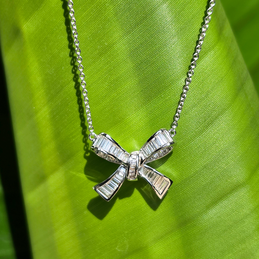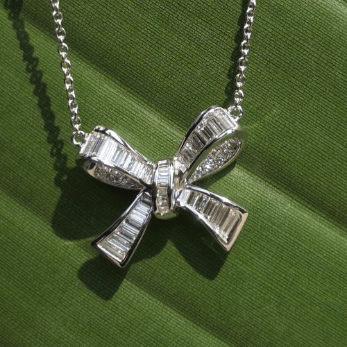 에메랄드컷 보우 네크리스, 화이트골드, 테파 다이아몬드, D 및 VVS1 등급의 랩 다이아몬드.