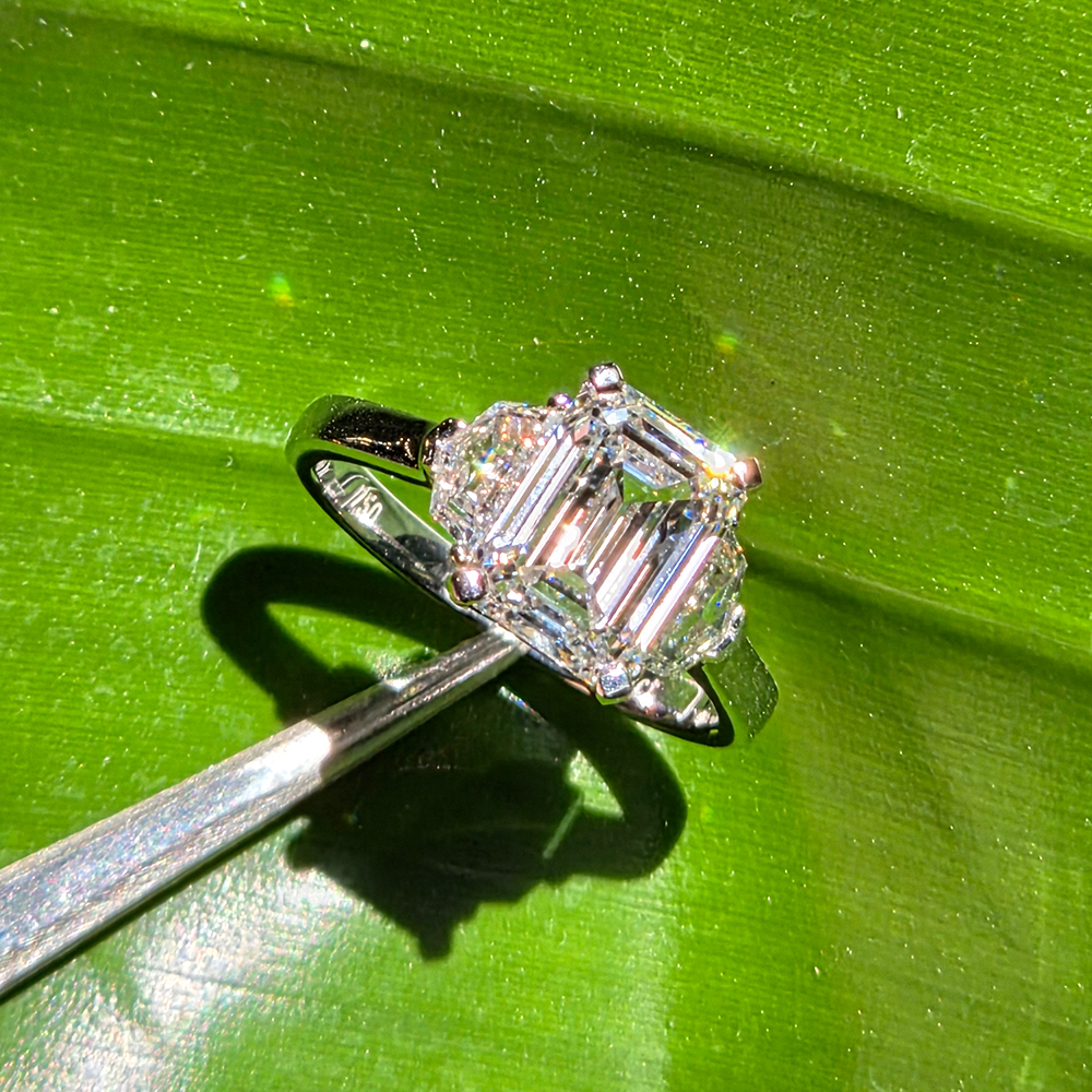 쓰리스톤 링, 화이트골드, 에메랄드 & 캐딜락 다이아몬드, D 및 VVS IDEAL 등급의 1 ~ 5캐럿 랩다이아몬드.