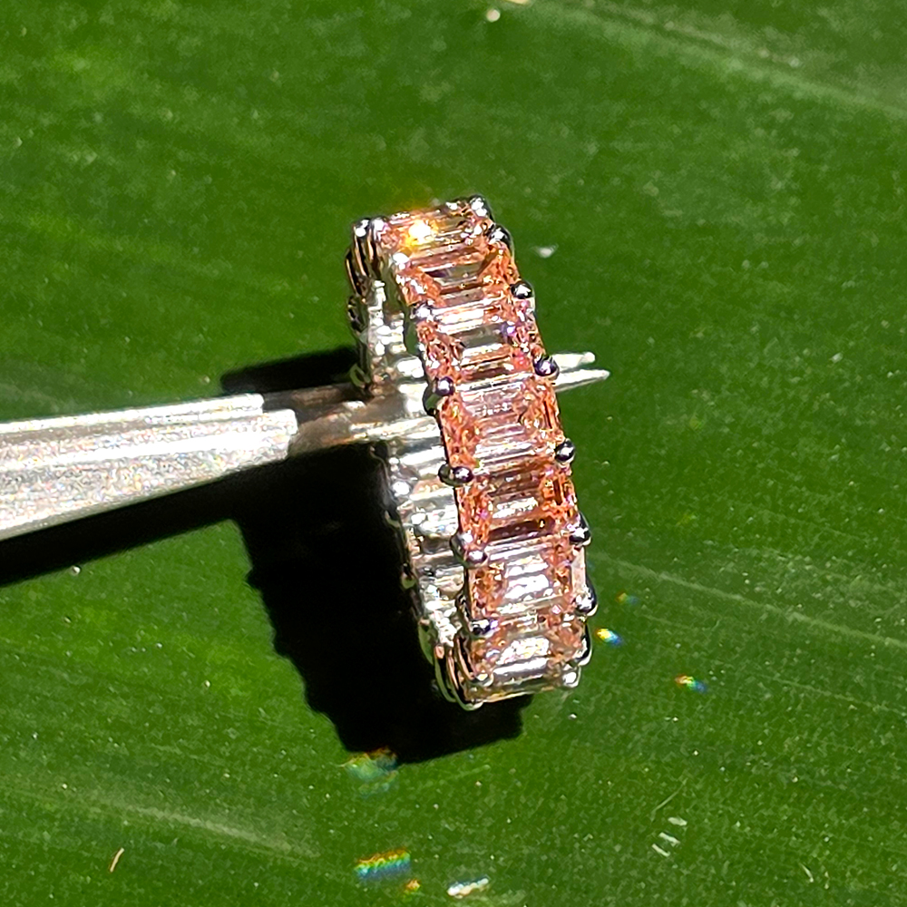 이터너티 링, 화이트골드, 핑크 에메랄드컷 다이아몬드, FANCY PINK 및 VVS 등급의 0.4캐럿 랩다이아몬드.