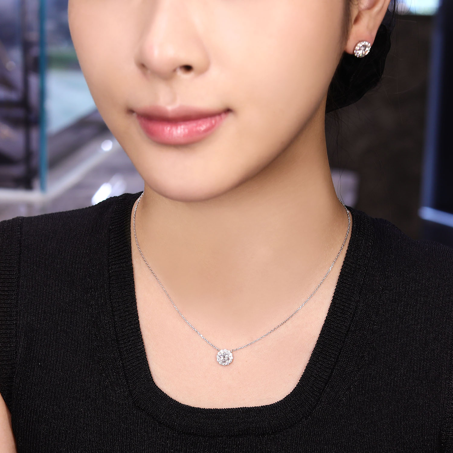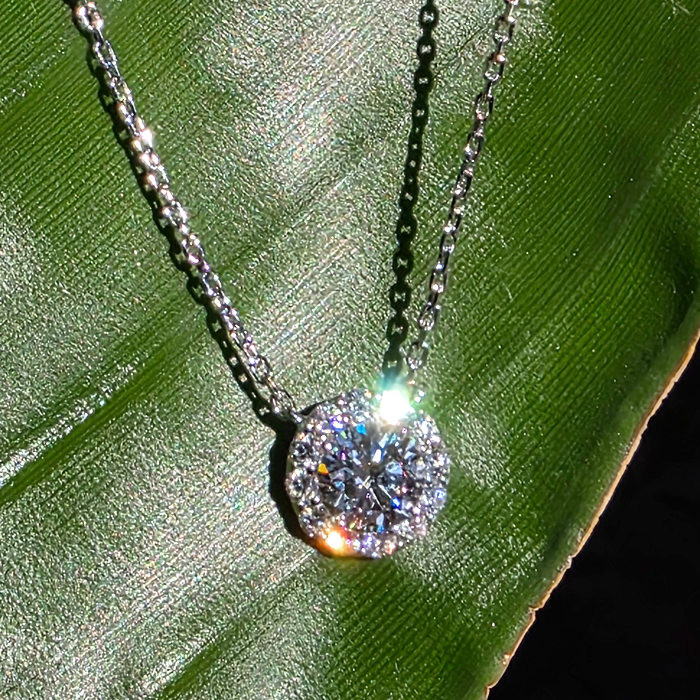 인게이지먼트 네크리스, 화이트골드, 라운드 다이아몬드, D및 VVS 등급의 1캐럿 랩다이아몬드. D 및 3EX 등급의 랩 멜리다이아몬드.
