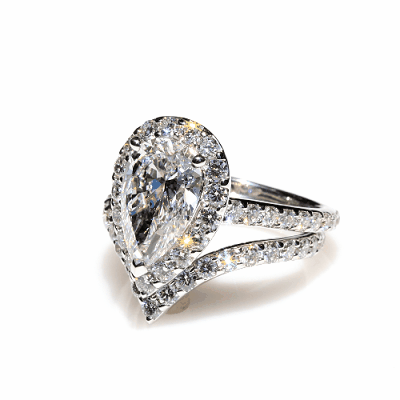인게이지먼트 링, 화이트골드, 페어 다이아몬드, D 및 VVS 등급의 1 - 5캐럿 랩다이아몬드. D및 3EX 등급의 멜리다이아몬드.