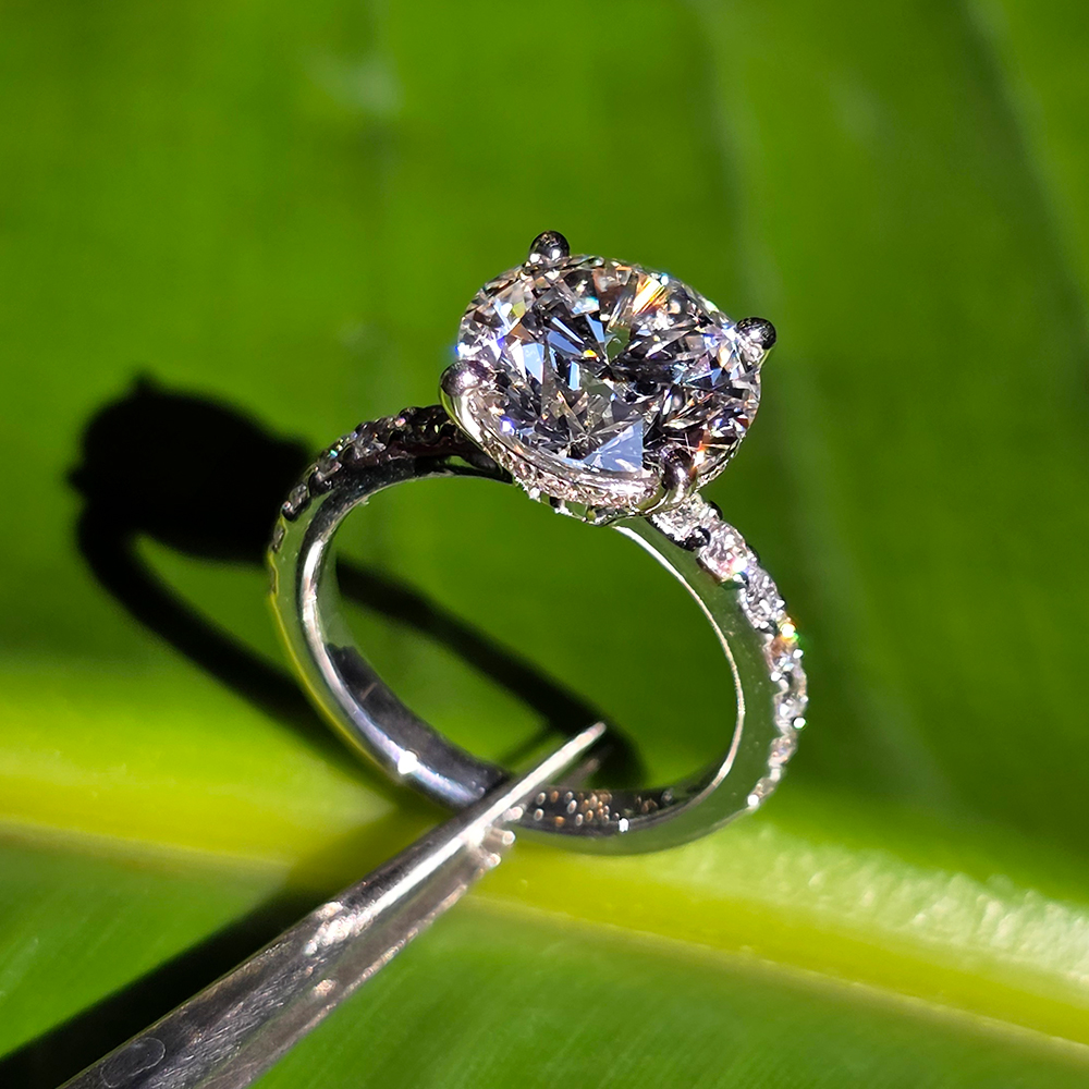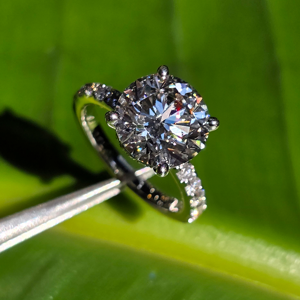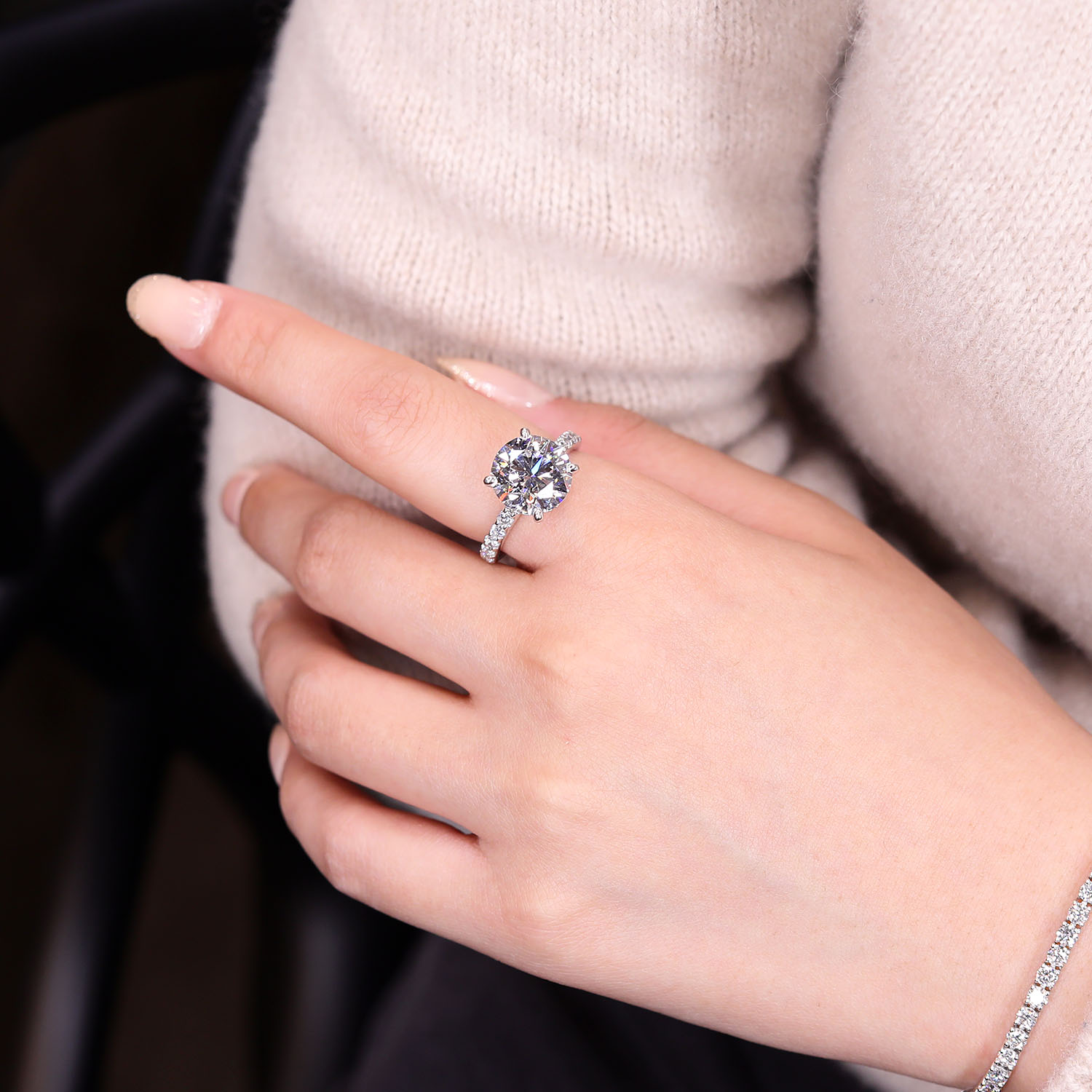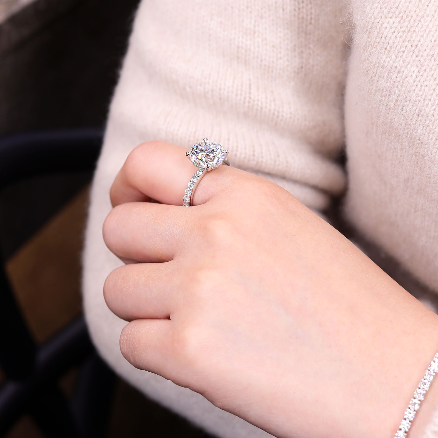 미뉴에트 링, 화이트골드, 라운드 다이아몬드, E D 및 VVS 등급의 1 - 5캐럿 랩다이아몬드. D 및 3EX 등급의 멜리다이아몬드.