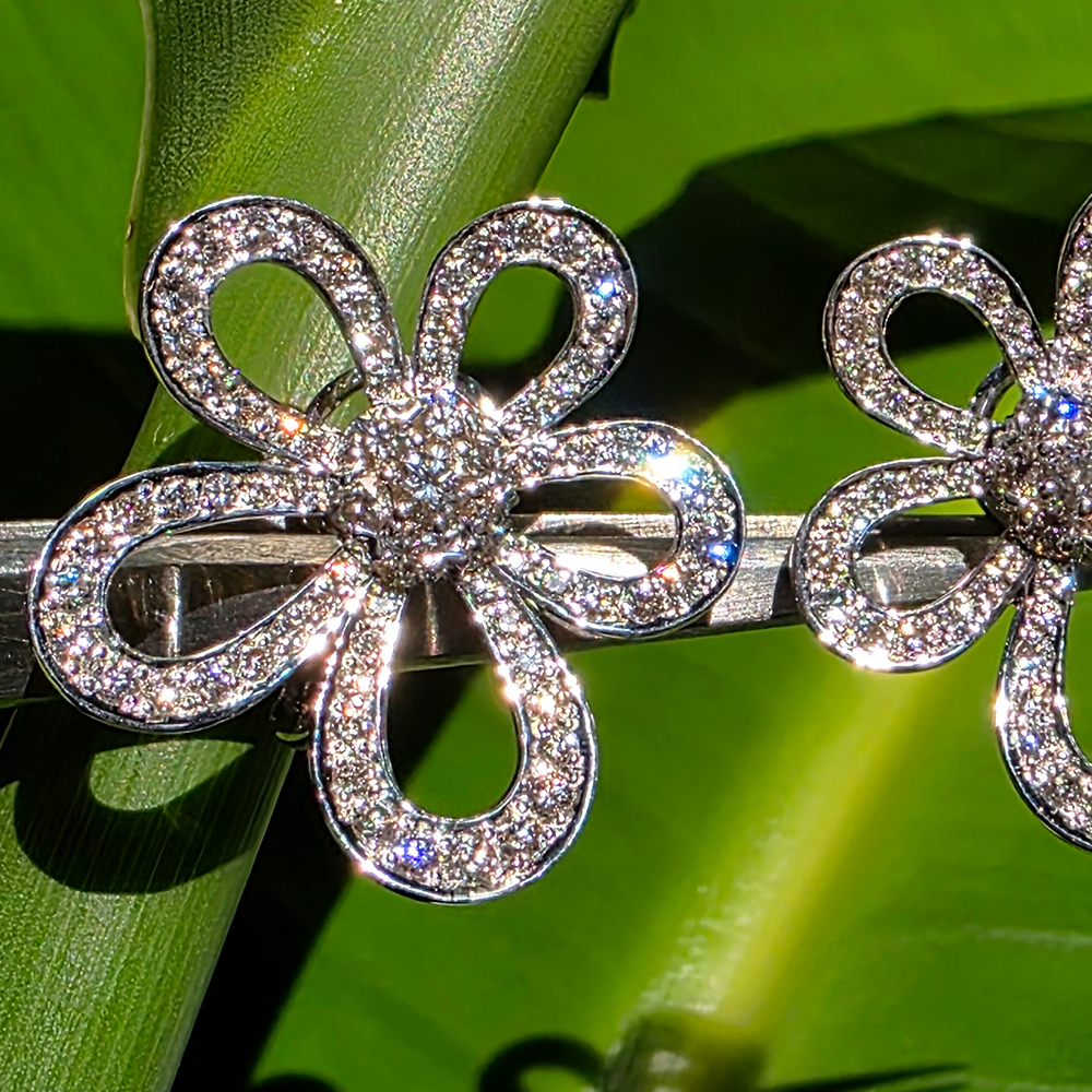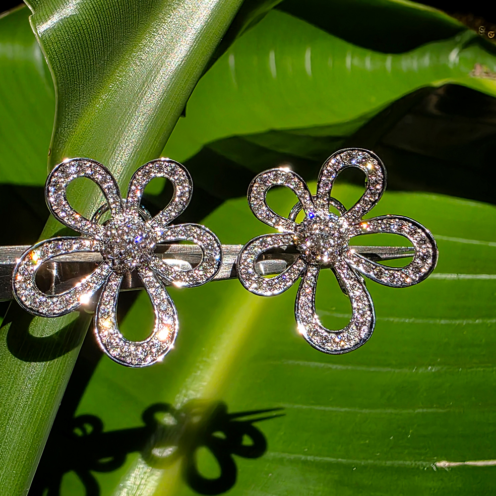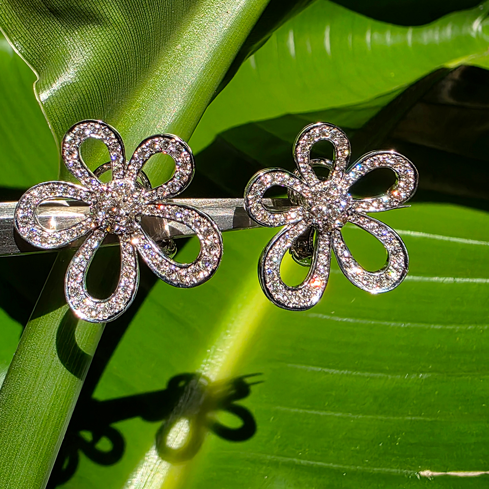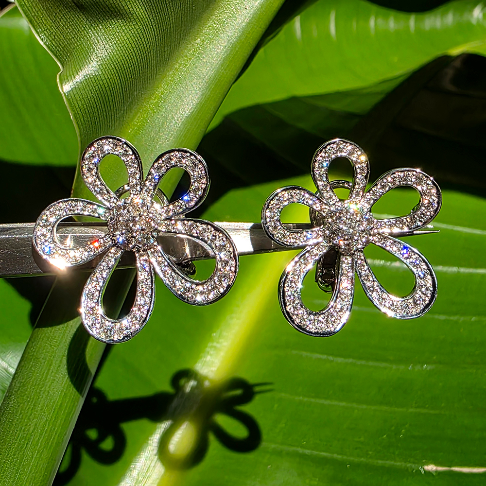 플라워레이스 이어링, 화이트골드, 라운드 다이아몬드, D및 VVS 등급의 랩다이아몬드, 원터치 형식.