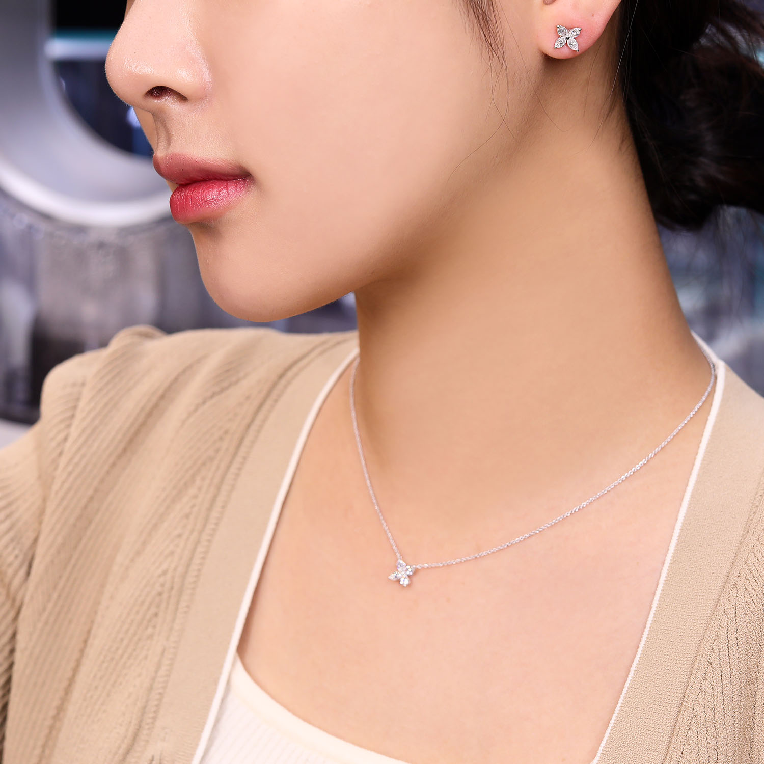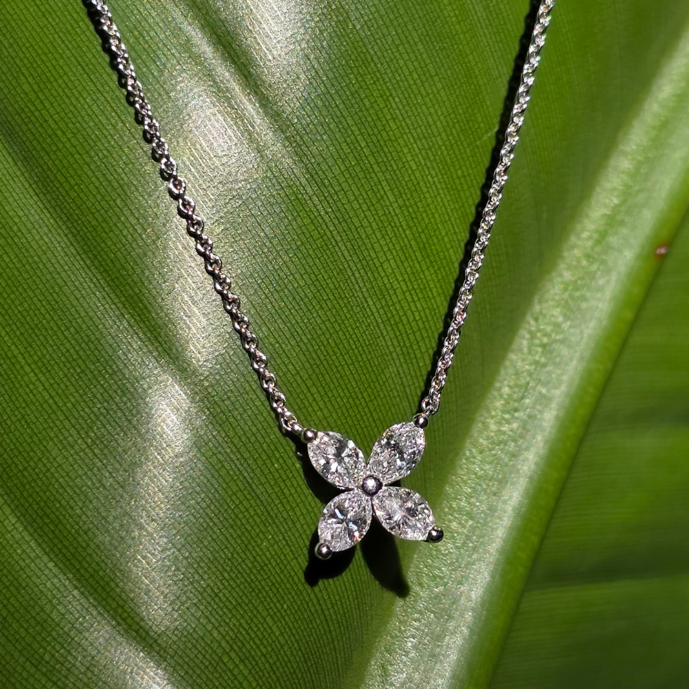 빅토리아 네크리스 스몰, 미디움, 화이트골드, 마퀴즈 다이아몬드, D 및 VVS1 등급의 랩 다이아몬드.