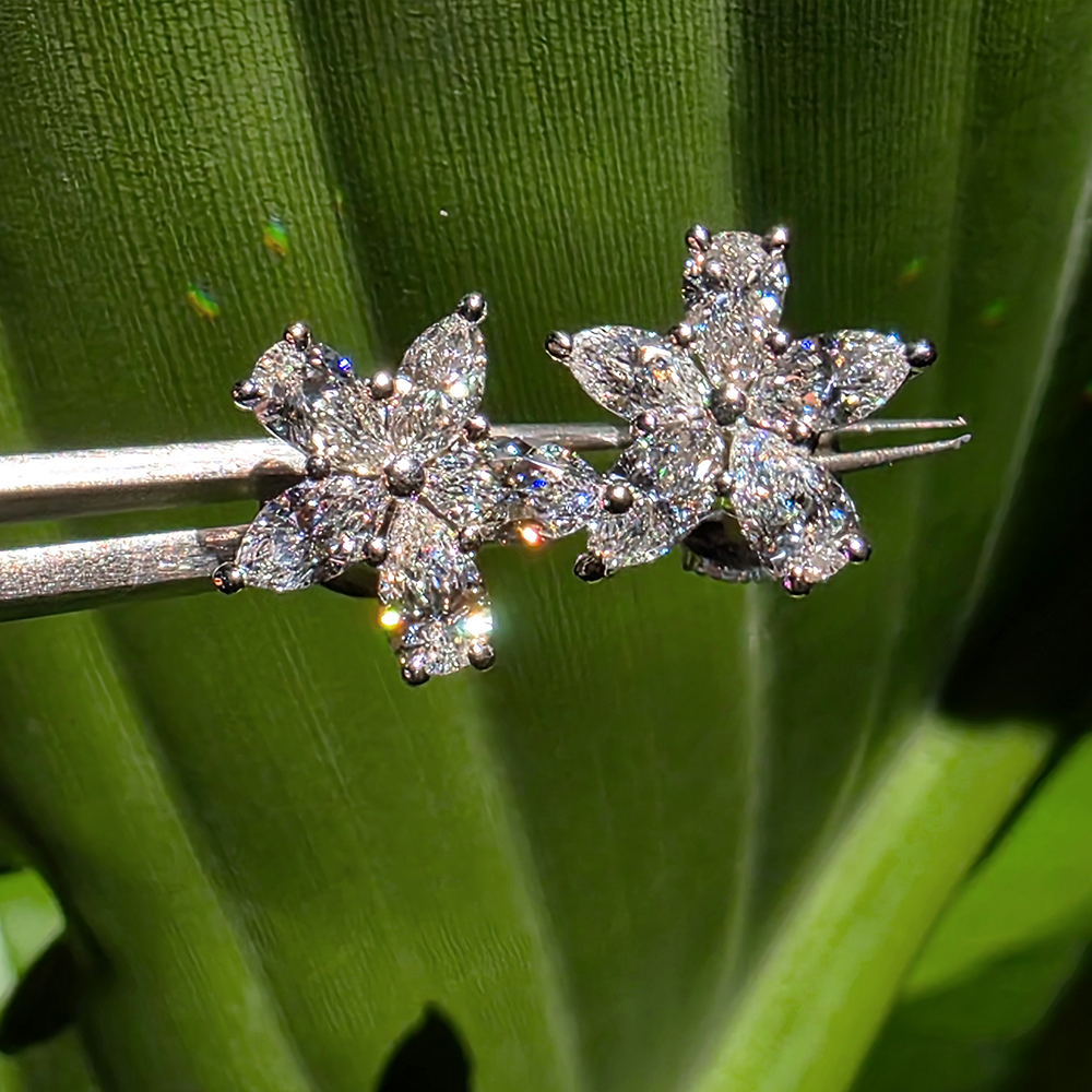 빅토리아 클러스터 이어링, 화이트골드, 페어, 마퀴즈 쉐입 다이아몬드, D및 VVS IDEAL 등급의 랩다이아몬드.