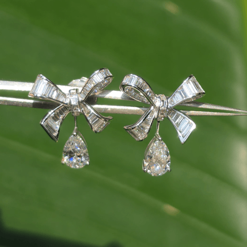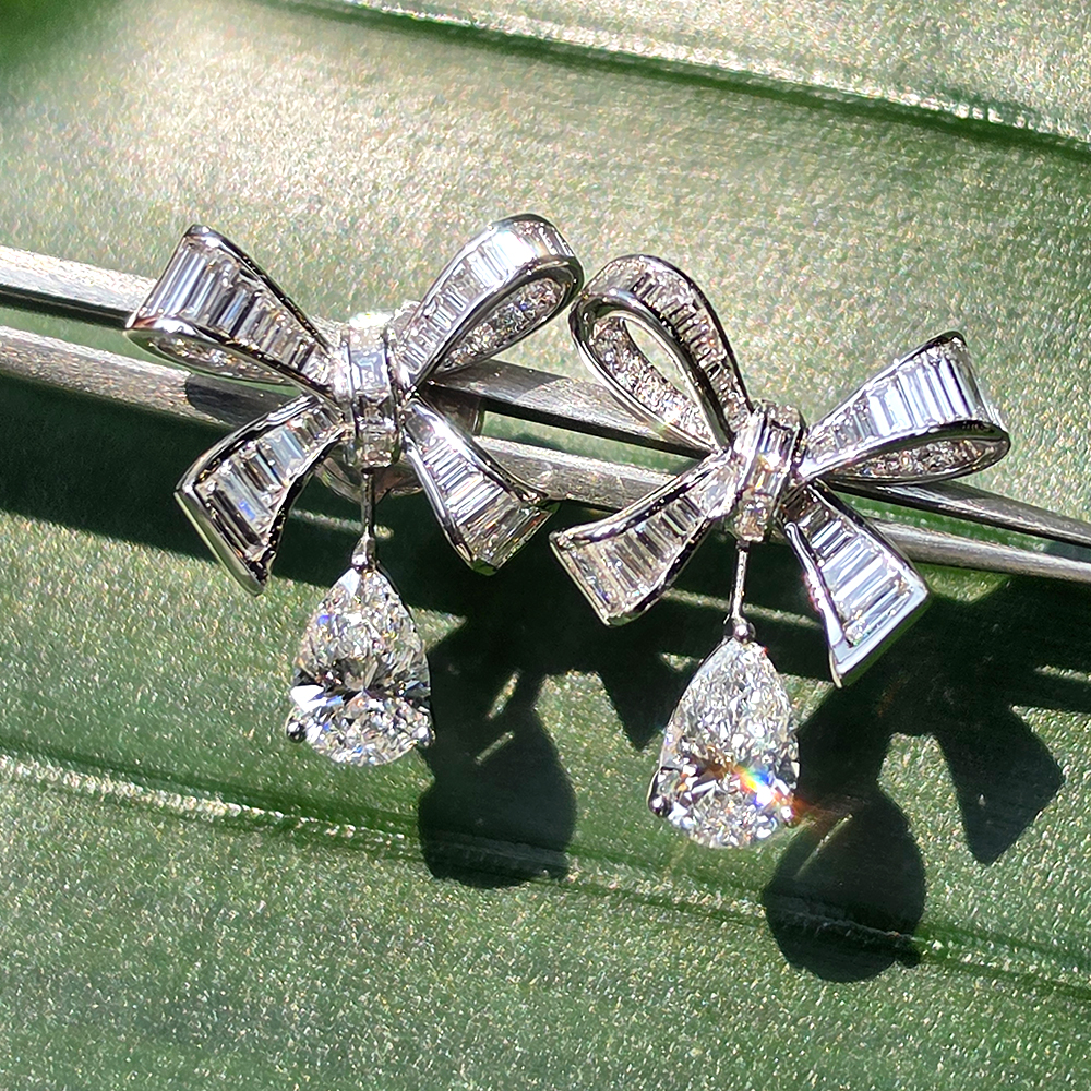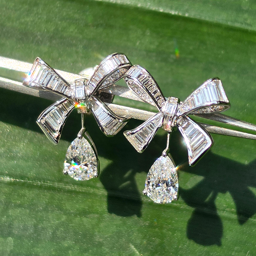 에메랄드 & 페어컷 드롭 이어링, 화이트골드, D 및 VVS IDEAL 등급의 랩다이아몬드.