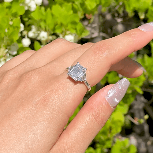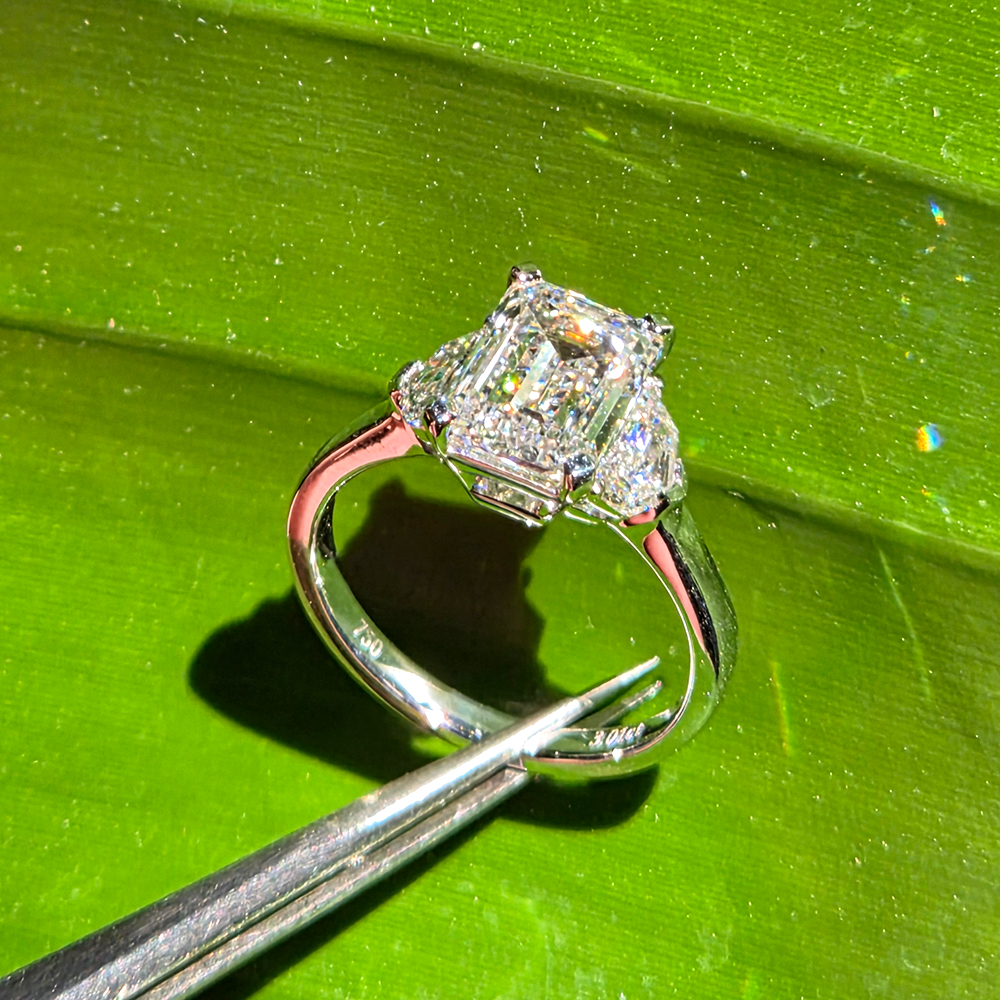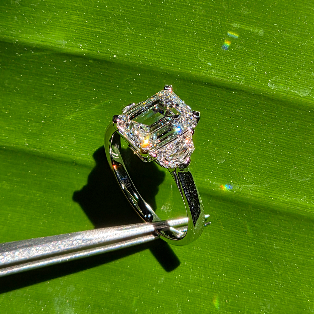 쓰리스톤 링, 화이트골드, 에메랄드 & 캐딜락 다이아몬드, D 및 VVS IDEAL 등급의 1 ~ 5캐럿 랩다이아몬드.
