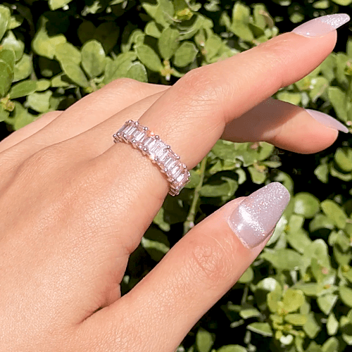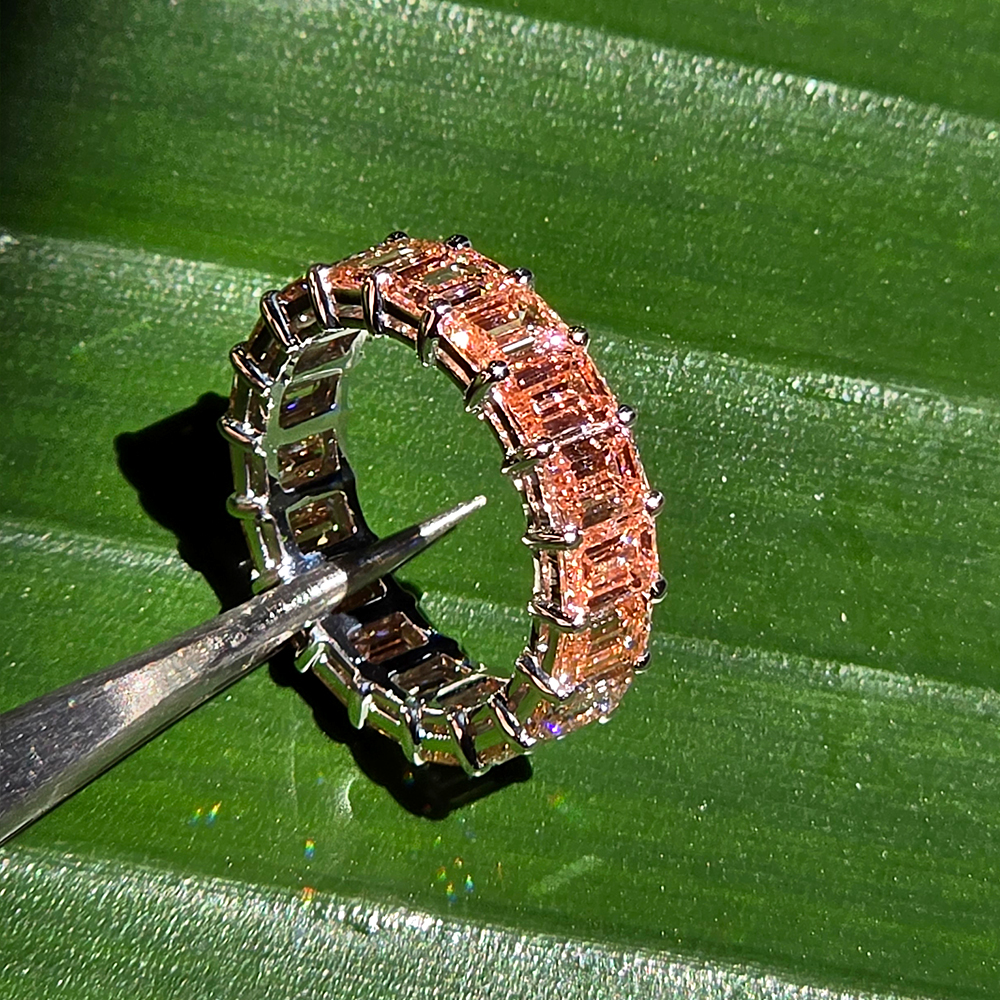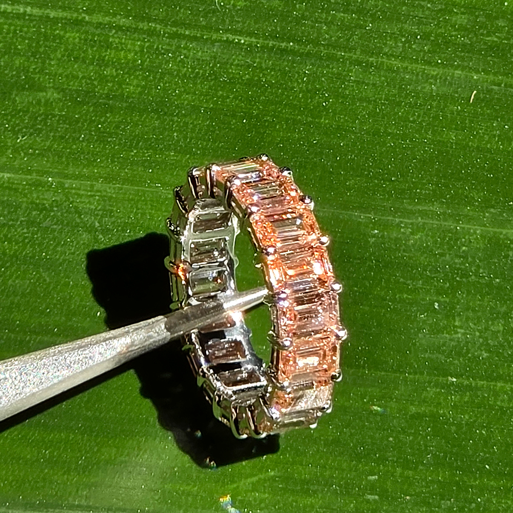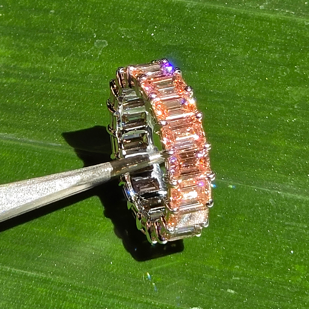 이터너티 링, 화이트골드, 핑크 에메랄드컷 다이아몬드, FANCY PINK 및 VVS 등급의 0.4캐럿 랩다이아몬드.